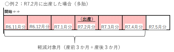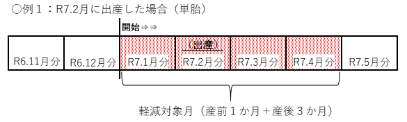 出産月を基準として、産前1か月と、出産月を含む産後3か月の、計4か月分の保険料を軽減します。多胎出産の場合は、産前3か月と産後3か月の計6か月分を軽減します。