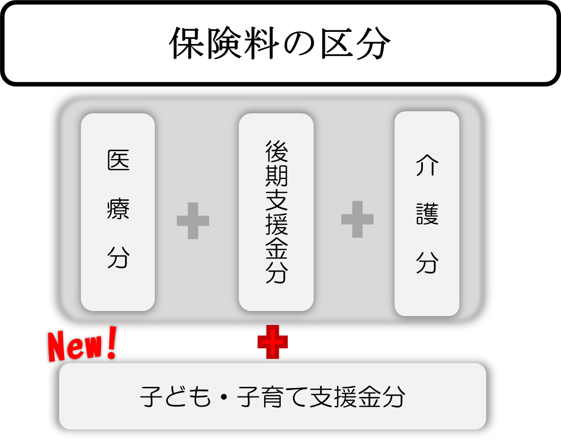 国による子ども・子育て世代を支える事業に充てるため、子ども・子育て支援金分保険料を18歳以上の被保険者全員に賦課します。今までの医療分・後期支援金分・介護分保険料に加え、新しい保険料体系となります。(国の説明では2026年度から3年間かけて段階的に引き上げられるとされています。)