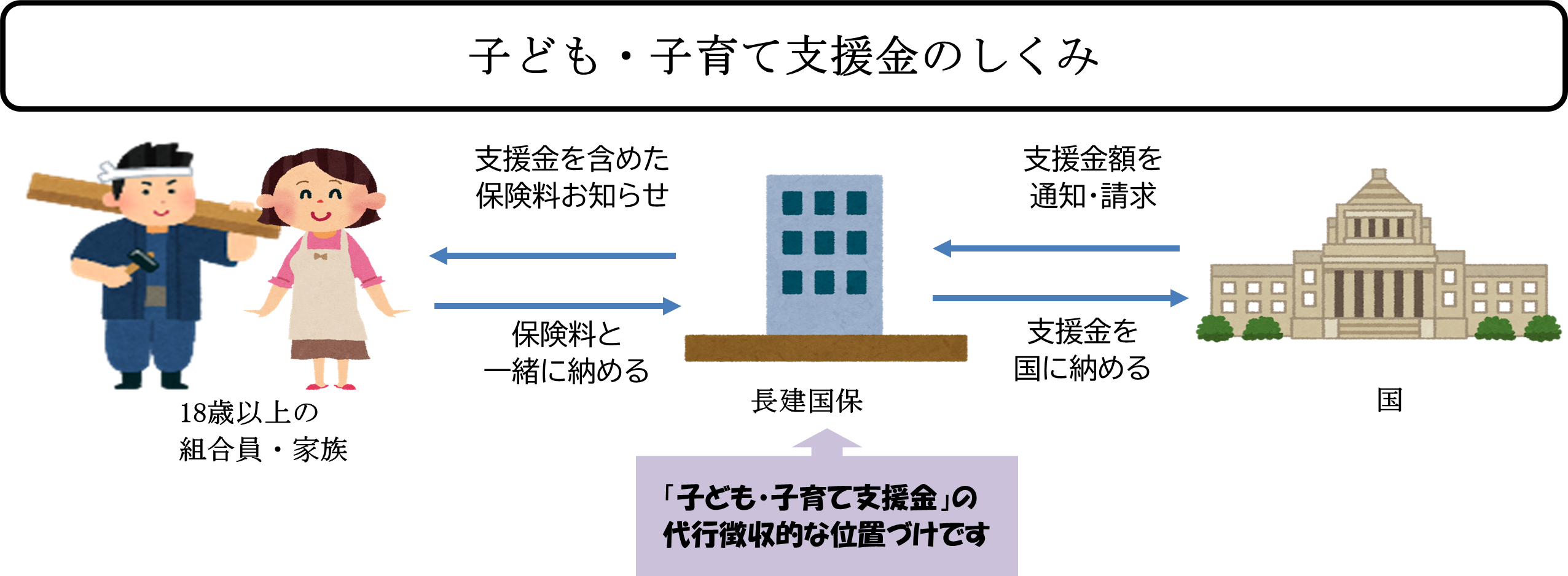 国の少子化対策を強化するために、全世代が協力して子どもや子育て世代を支える新しい連帯の仕組みです。長建国保を含む全ての健康保険で始まる制度です。